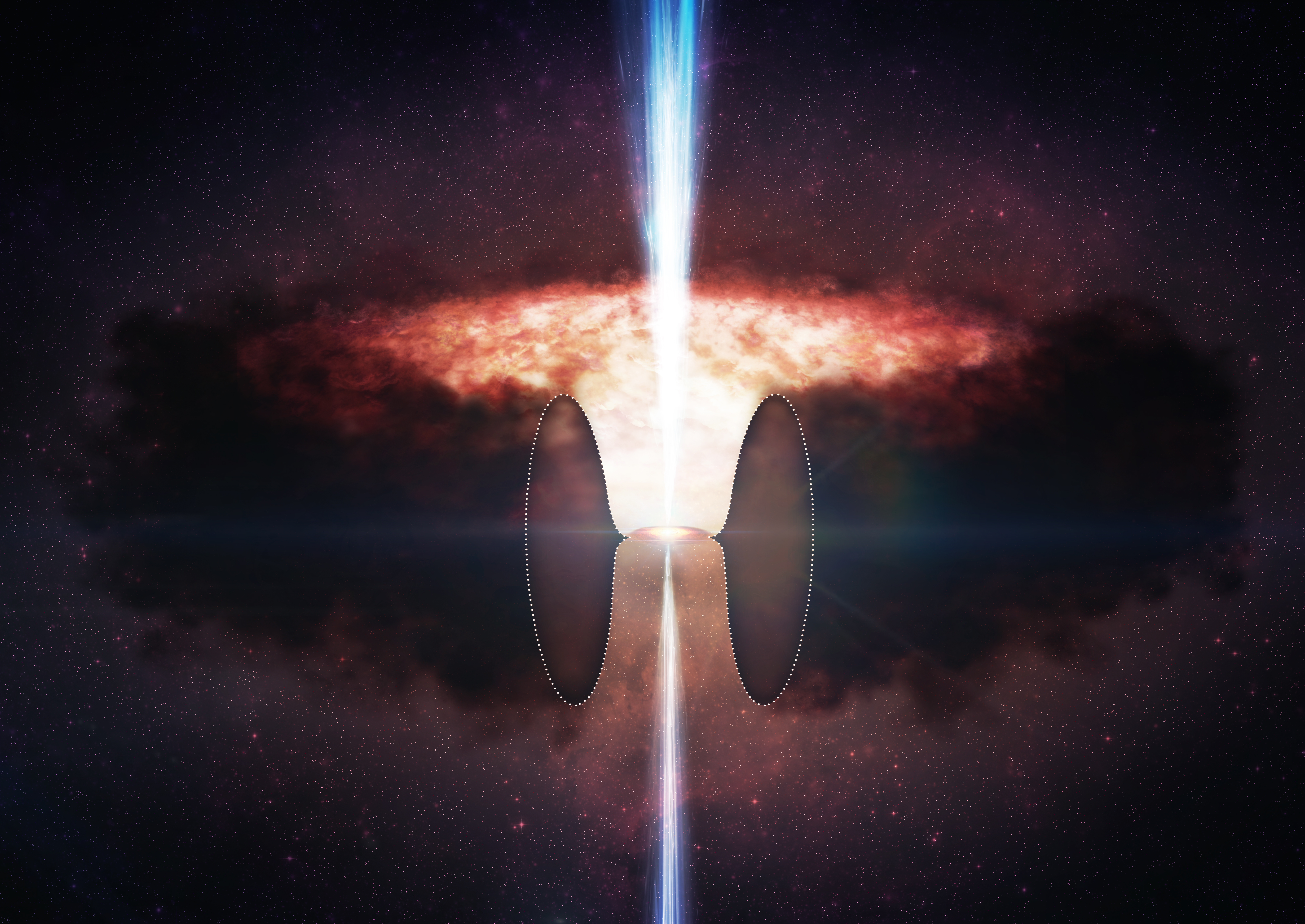 Artist’s depiction of a compton thick quasar in an active galactic nuclei showing a supermassive black hole surrounded by a thick cloud of dust, and with bright jets streaming from the center of the black hole.